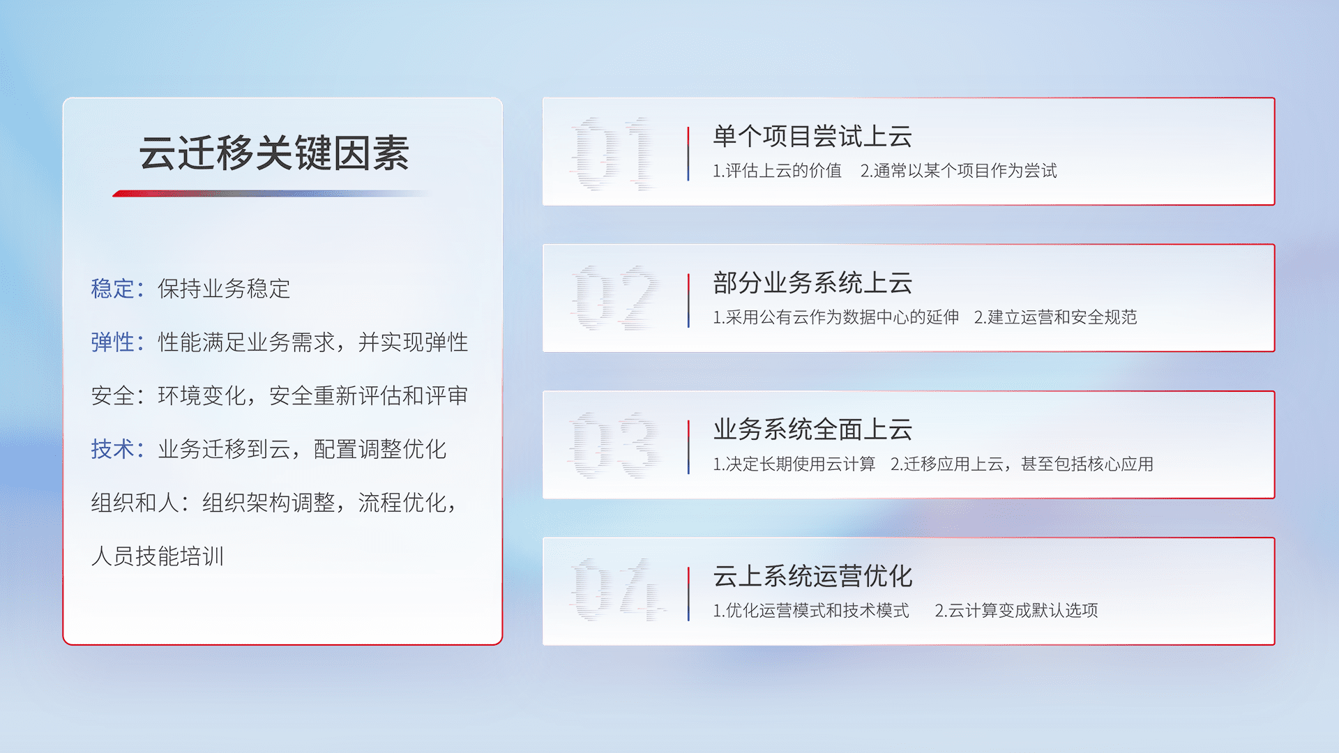 结合实际业务,,,,从规划设计、、、云平台选型、、云原生改造、、数据迁移、、集成交付,,,,迁移全过程为客户识别最佳上云路径,,,,做好风险识别管理,,,设计网络架构、、身份权限、、安全审计合规、、、、操作审计、、、日志审计、、监控告警策略、、、、多站点容灾设计等,,,,对云上基础设施进行整体规划,,,提升IT治理水平,,,以满足弹性、、高可用、、、高性能的需求。。