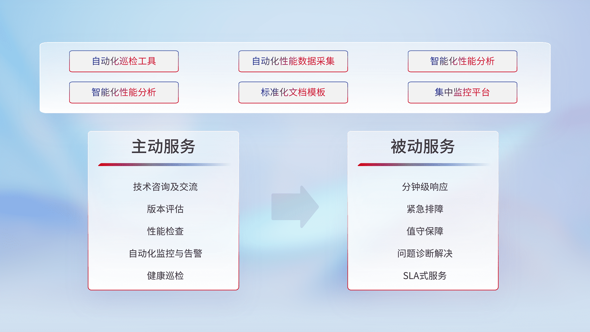 智能化工具和标准化文档,,保障服务质量,,,,提供主动服务(包含技术咨询、、版本评估、、、性能检查、、、、自动化监控与告警、、健康巡检)和被动服务包含(分钟级响应、、、、紧急排障、、、值守保障、、、、问题诊断解决、、、SLA服务)。。
